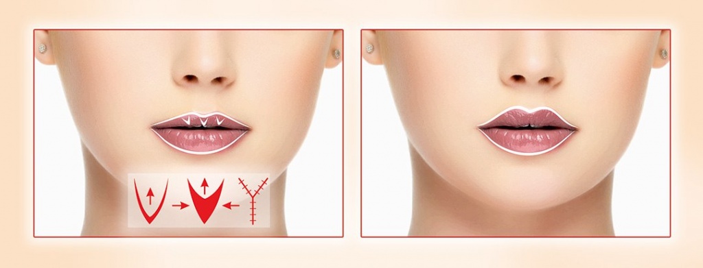 - Хейлопластика V-Y. Суть метода состоит в выполнении V-образных надрезов на пигментированной поверхности губы. После выполнения надреза губам придается необходимая форма, которая закрепляется при помощи Y-образного шва. Количество и длина разрезов может варьироваться в зависимости от желаемого результата;