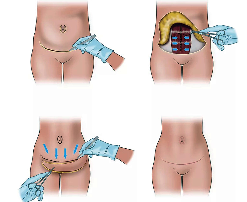 - Абдоминопластика, классический вариант. Операция осуществляется через операционный разрез, который делается в области бикини. Предполагает удаление жировой клетчатки, подтяжку обвисшей кожи и сшивание прямых мышц. Операция предполагает формирование нового пупка;