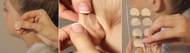 - После этого, следует снять защищающую оболочку с клейкой стороны, одну часть нужно прикрепить к верхней части уха (сзади), другу-к голове (за ухом).