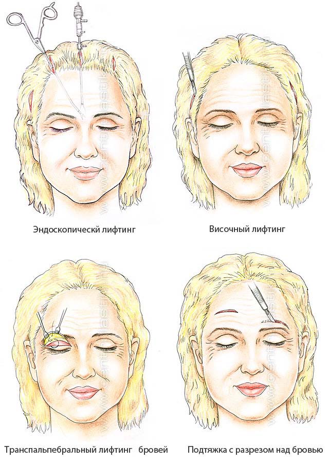 - Техника подтяжки с использованием эндоскопа. Разрезы для ввода эндоскопа делаются в задней части головы. При помощи эндоскопа рассекаются спайки и мышцы, которые образуют морщины. После этого, при помощи того же эндоскопа, брови поднимаются и фиксируются в нужном положении. Методика характеризуется низкой инвазивностью и быстрым периодом реабилитации;