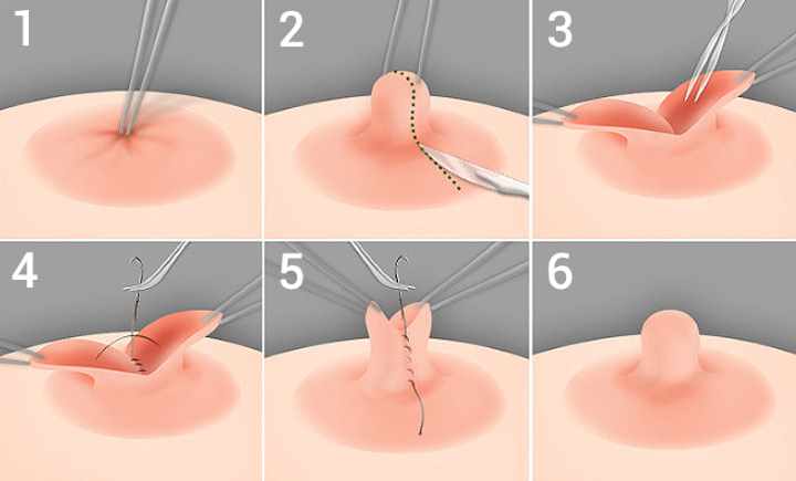 Дефект втянутого соска провоцируется молочными протоками. Поэтому, для его устранения прибегают к освобождению от молочных проток путем частичной резекции. Этот вид коррекции проводится не только с эстетической целью, но и с целью более эффективного кормления во время лактационного периода. Для освобождения молочных проток используются небольшие надрезы, длина которых не превышает одного сантиметра.