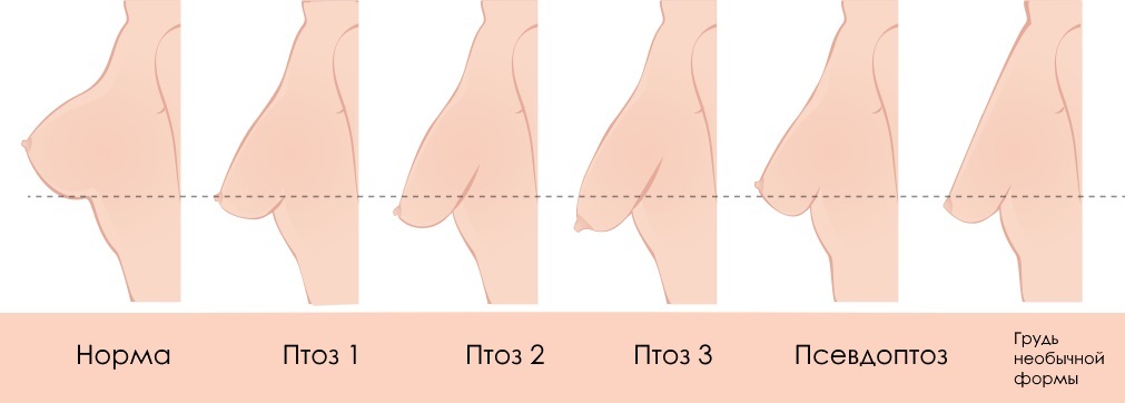 При нормальном состоянии соска и ареолы их расположение должно быть не ниже уровня середины плечевого сустава, не важно, какой комплектации женщина. Поэтому опущение молочной железы определяется в зависимости степени смещения сосково-ареолярного комплекса относительно выше указанной нормы.