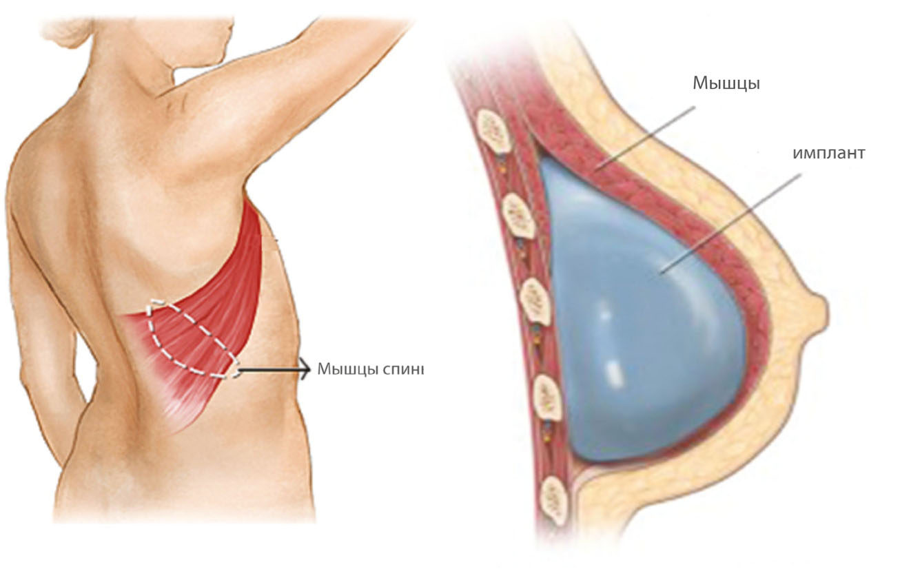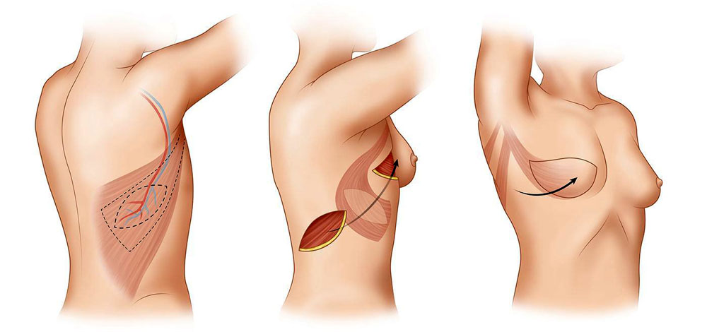 Методы восстановления, предполагающие пересадку отдаленных донорских лоскутов с кожно-мышечной тканью так же производятся с установкой эндопротеза. Однако, в данном случае эндопротеззакрывается собственной кожей пациента, что значительно снижает риск возникновения возможных осложнений. В качестве донорского места выбирается лоскут ткани на основе широчайшей мышцы спины. Так называемый – ТДЛ лоскут состоит из мышцы, подкожной жировой клетчатки и кожного покрова.