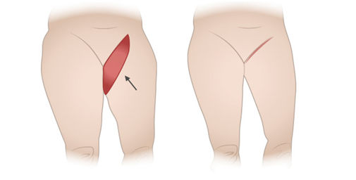- При наличии большого количества излишков кожи и ткани в районе бедер, убирается клинообразный участок, находящийся на внутренне стороне. Для этого делается вертикальный надрез, который начинается от пахового изгиба и заканчивается в районе внутренней части колена;